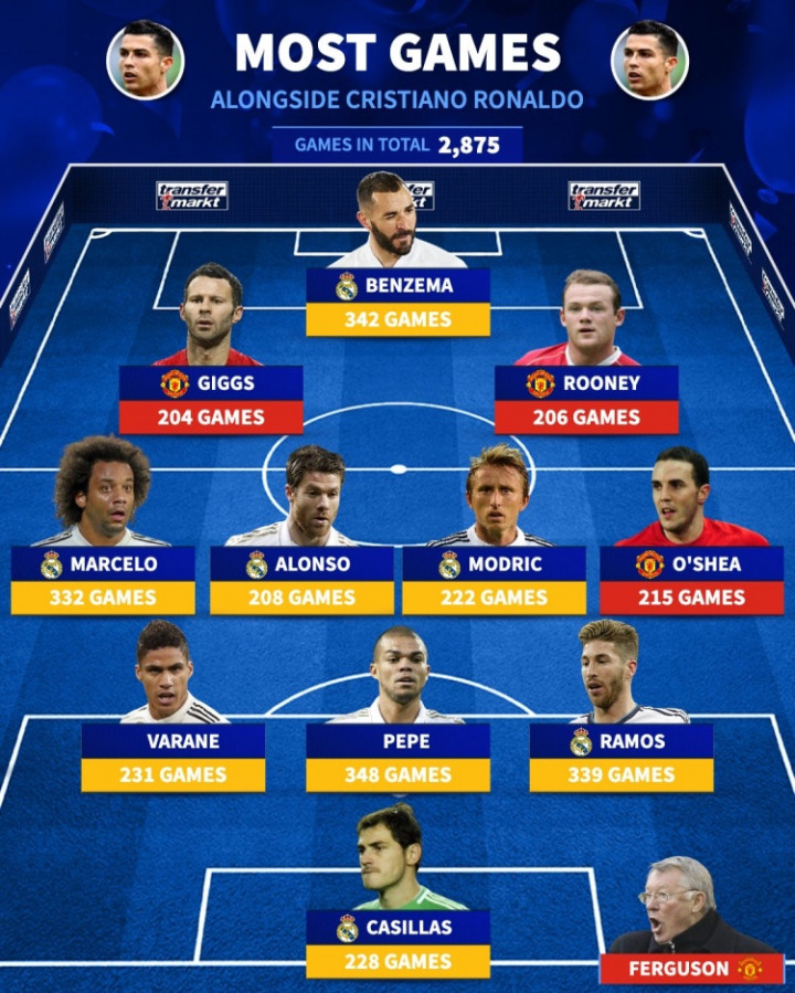 和C罗一起出场最多队友阵: 魔笛本泽马在列, 鲁尼吉格斯两翼齐飞